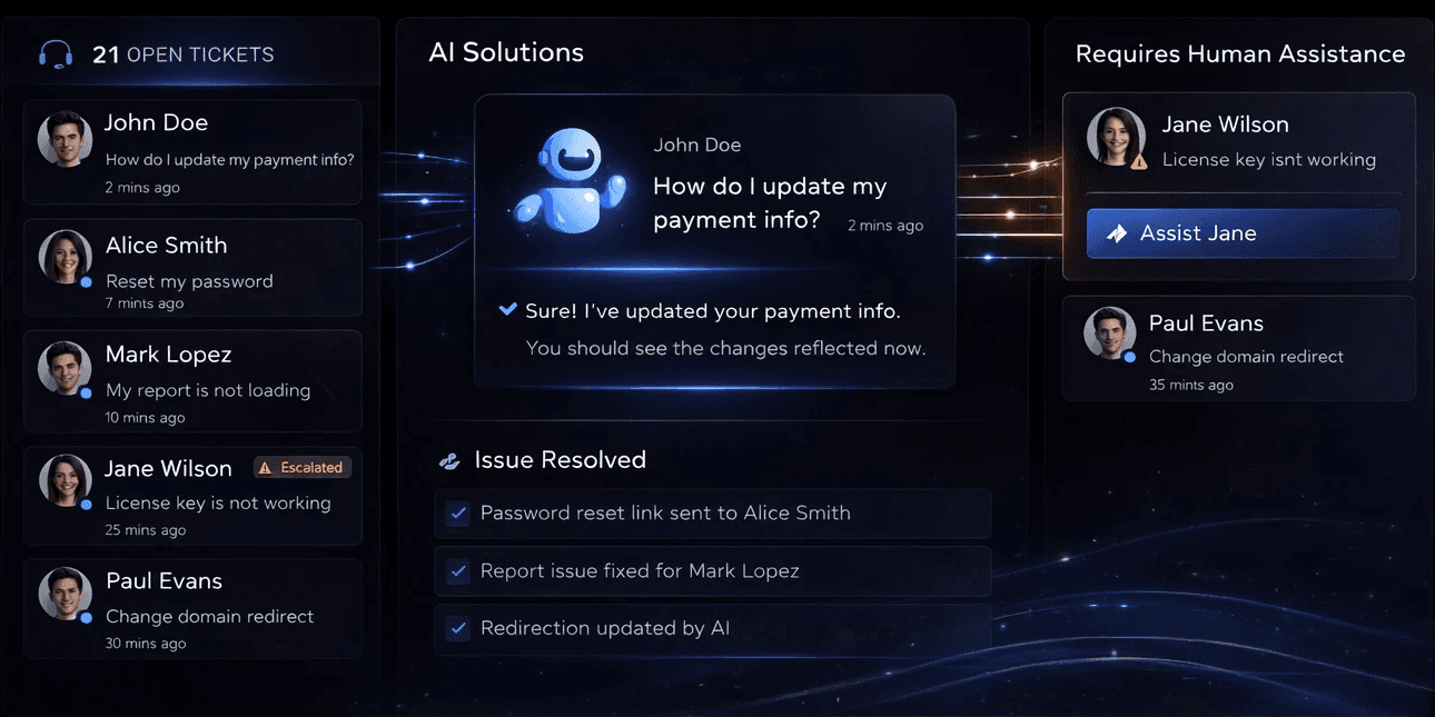 This Agent clears the queue of repetitive tickets, solves issues in seconds, and only hands over what truly needs a human. While it lightens the workload of your support team, it will help your users leverage your software fully.