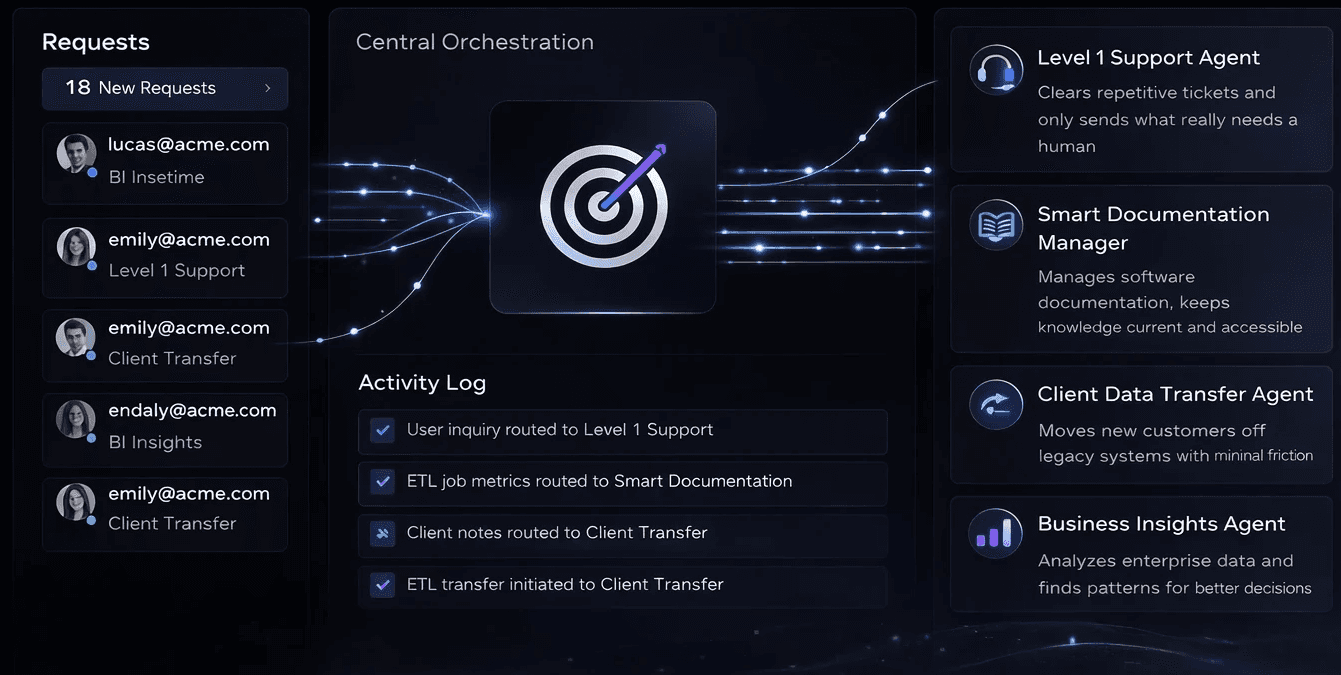 The AI brain of your product. It catches every request and instantly routes it to the right specialist agent so users get the exact action they need, not another generic answer.